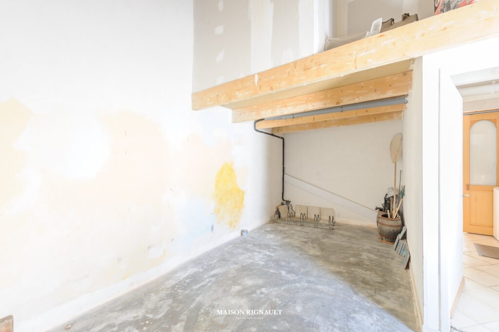 Un garage, une arrière-cuisine, une cuisine ouverte sur le salon-salle à manger et un WC indépendant.