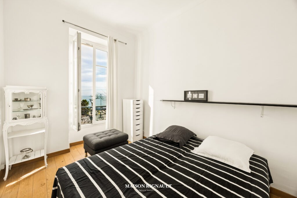 L'appartement dispose de deux grandes chambres, dont une côté mer, avec placards intégrés. La salle d'eau est fonctionnelle et bénéficie d'une lumière directe.