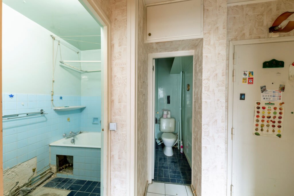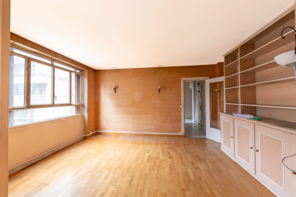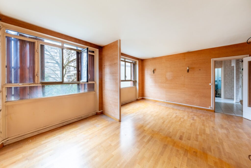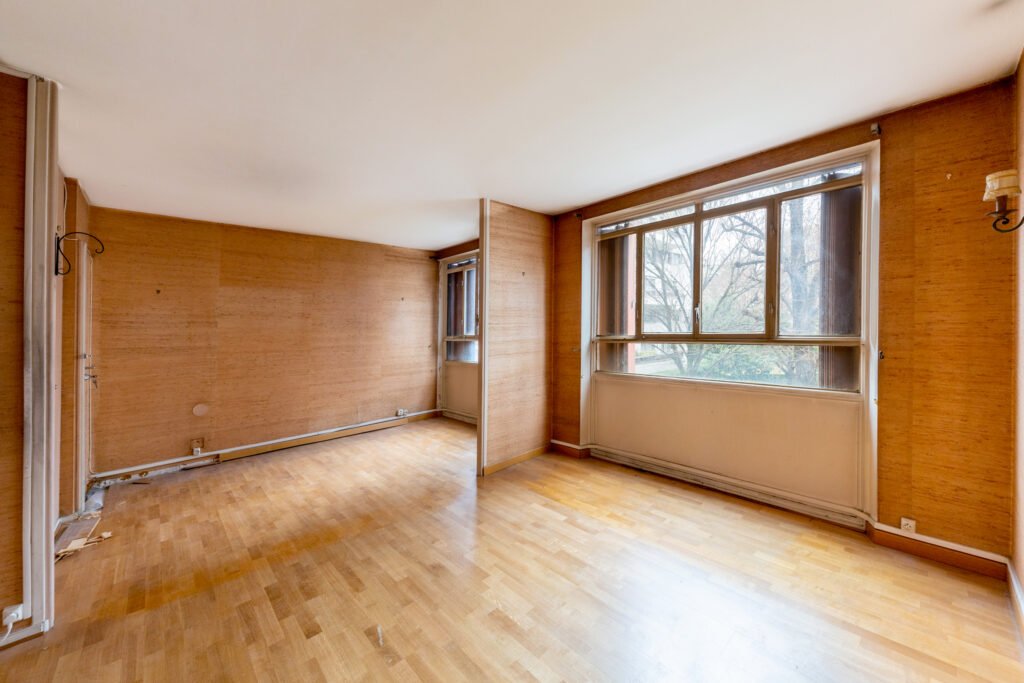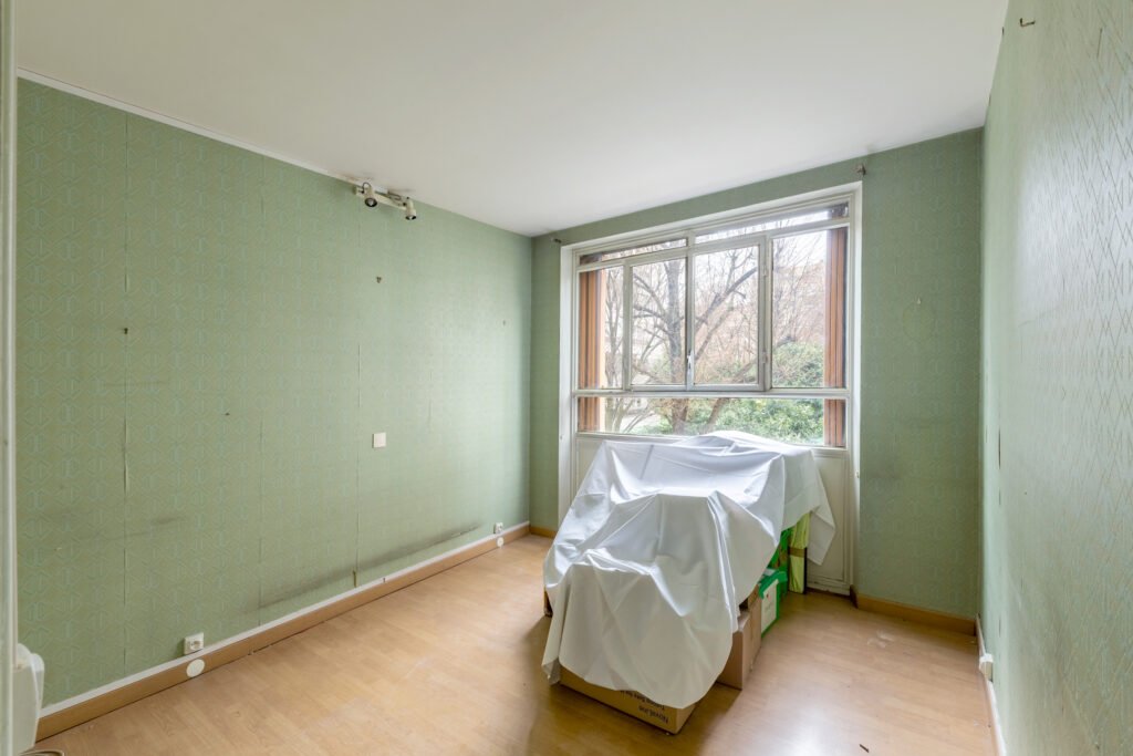 Paris 15e. Rue Franquet. Dans un immeuble bien entretenu. Au 1er étage donnant sur jardin. Appartement 2/3 Pièces entièrement à rénover. comprenant une entrée, une chambre, une salle de bains, un wc séparés, un double séjour (possible deuxième chambre)