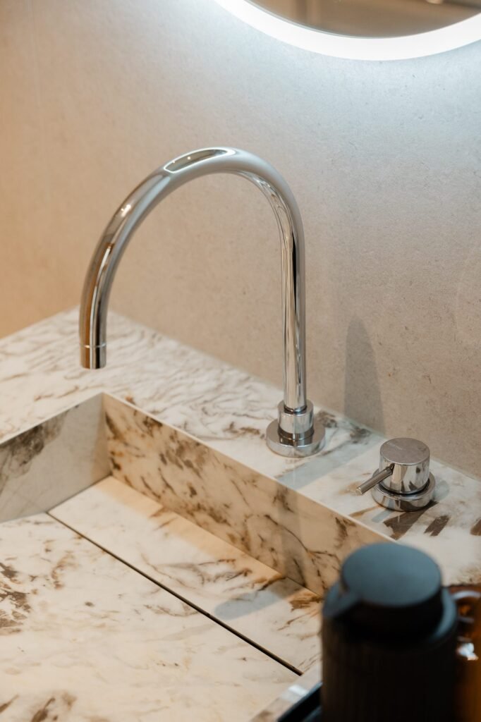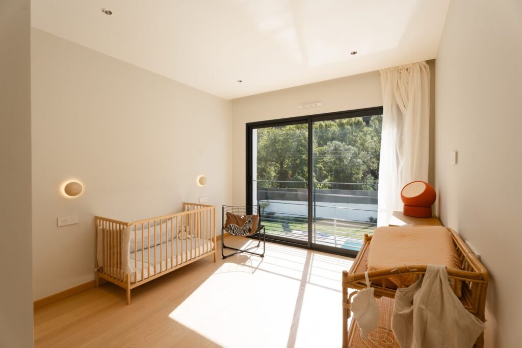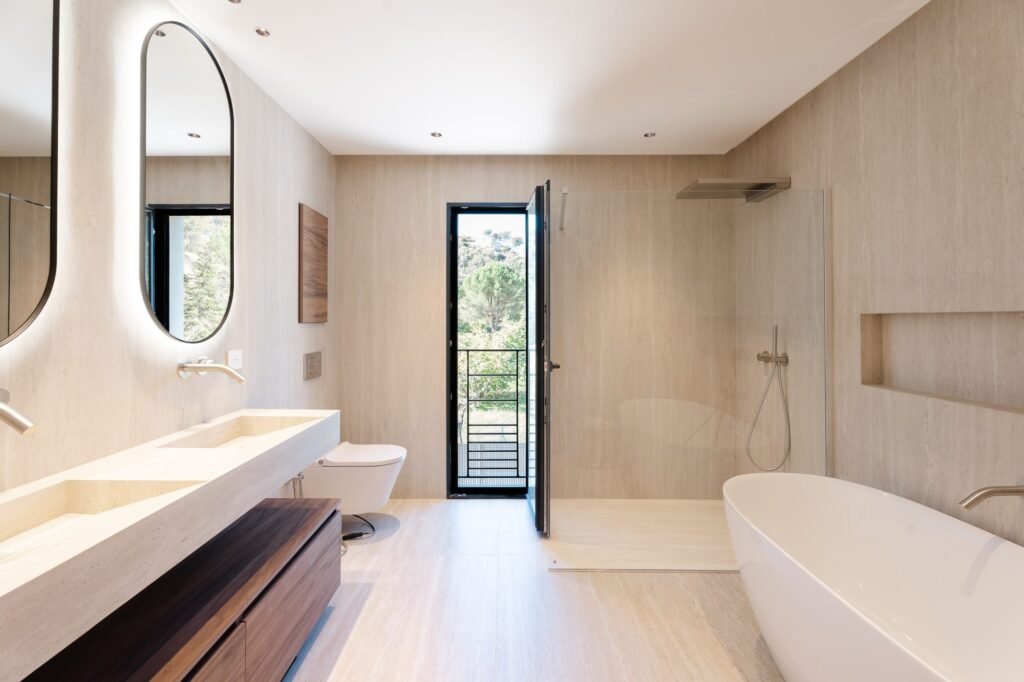 Le rez-de-chaussée s’articule autour d’un grand espace de vie traversant. La cuisine haut de gamme entièrement équipée est ouverte sur le séjour. Les circulations sont fluides, les volumes lisibles.