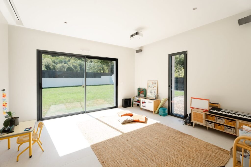 L’architecture est claire et efficace : lignes tendues, volumes généreux, larges baies vitrées toute hauteur qui assurent une vraie continuité intérieur / extérieur. La maison est pensée pour capter la lumière et ouvrir les perspectives vers le jardin et la piscine.