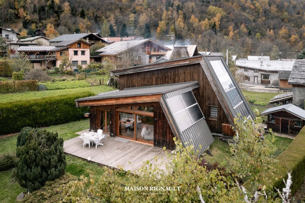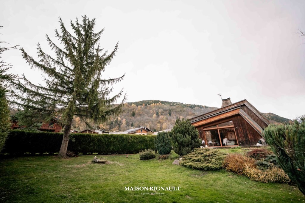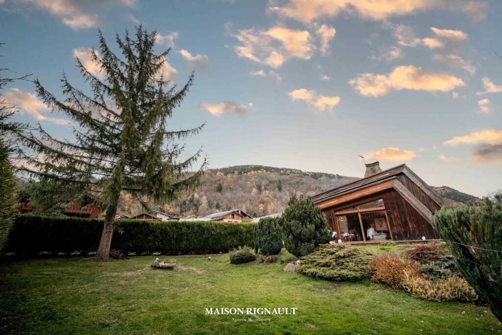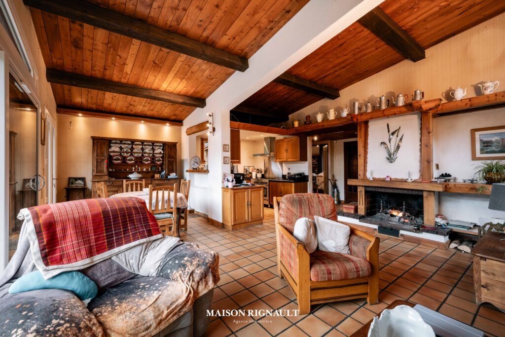 Sur environ 125 m² au sol , elle offre un vaste séjour avec cheminée, une suite parentale au rez-de-chaussée, ainsi qu’une cuisine centrale. À l’étage, deux chambres et une selle de bain s’ouvrent sur une vue terrasse et sur les montagnes environnantes.