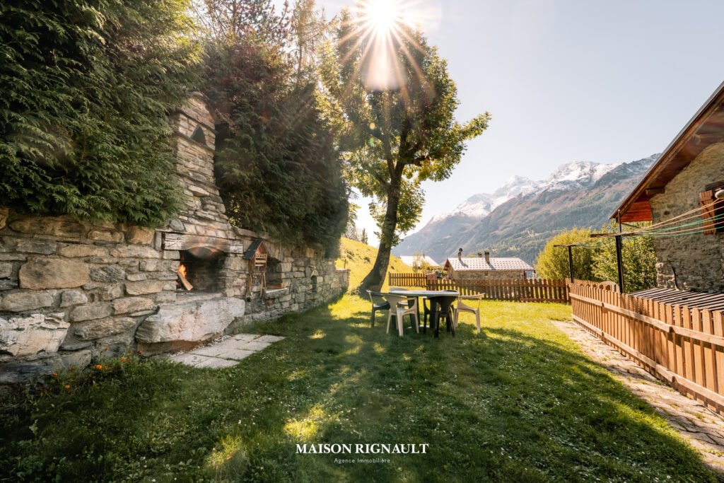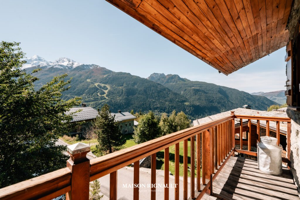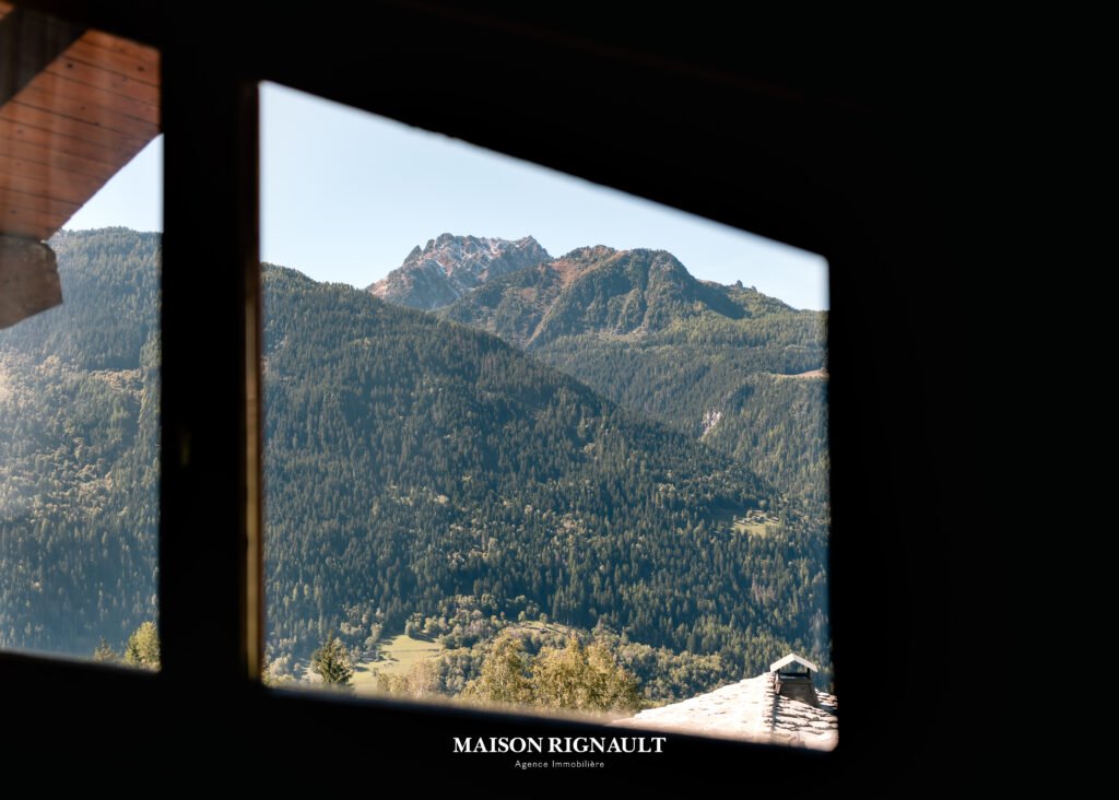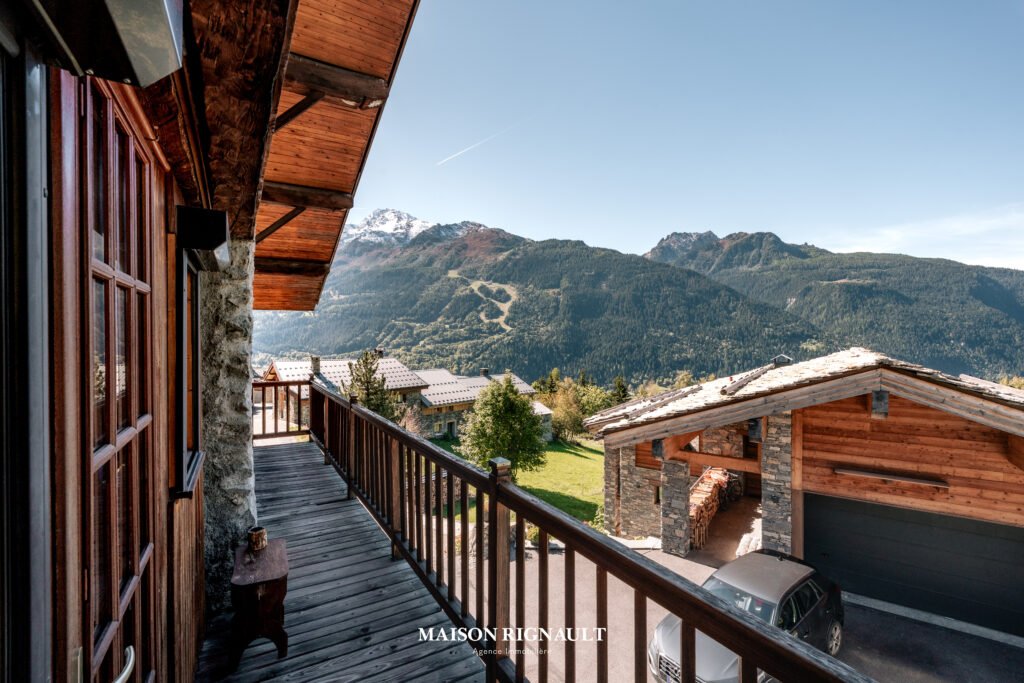 Sa grande terrasse et son vaste espace extérieur s’ouvrent sur une vue panoramique à couper le souffle, embrassant la vallée et les sommets environnants. Une cheminée avec foyer ouvert sur la terrasse prolonge l’ambiance chaleureuse, invitant à profiter des soirées d’altitude en toute saison. Trois balcons viennent compléter cet espace de vie, tandis qu’un potager aménagé sur une partie de la parcelle apporte une touche de charme et d’authenticité supplémentaire.